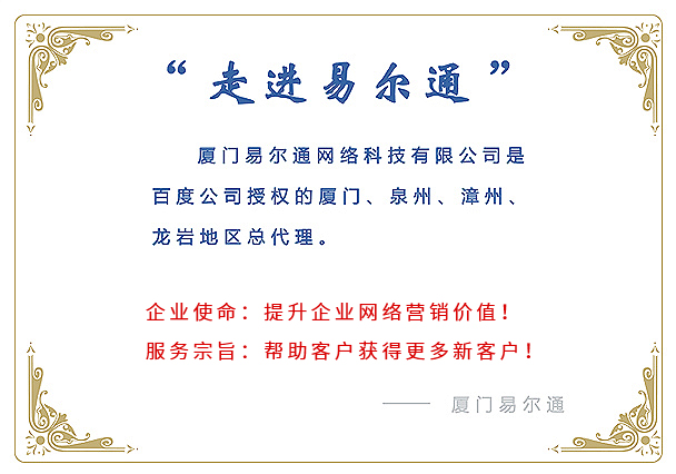 廈門易爾通網絡科技有限公司,成立于2005年,總部位于廈門軟件園二期,作為百度在閩南及粵東地區(qū)營銷代理商,自成立以來一直本著以“客戶服務為中心”的營銷理念, 樹立“專業(yè)、及時、高效”的服務標準以及“積極、熱情、誠信”的合作態(tài)度,為廈門、泉州、漳州、龍巖、惠州、汕頭等多座城市企業(yè)提供百度營銷、品牌策劃、網站建設、會議營銷方案等10余項全方位營銷服務。