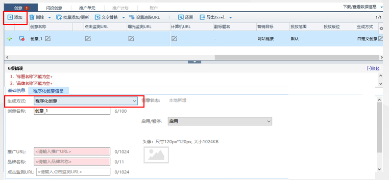 1.填寫程序化創意“基礎信息”:點擊“添加創意”,在編輯區選擇生成方式,請選擇“程序化創意”,在基礎信息編輯區填寫創意名稱、推廣URL等信息。
