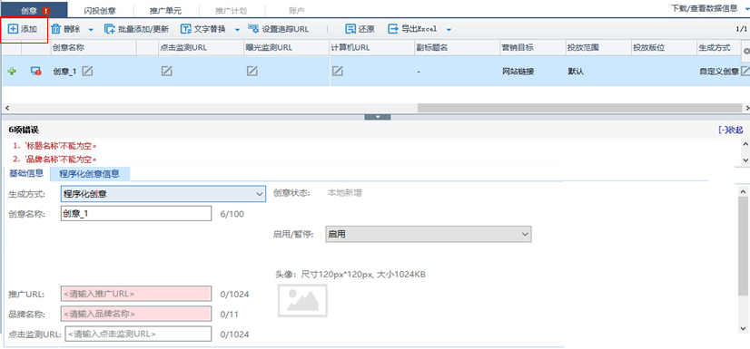 基礎信息(如創意名稱、url)可在列表區編輯,程序化創意標題名稱、樣式僅可在編輯區編輯;