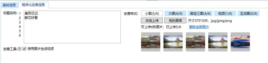 2.填寫“程序化創意信息“:生成方式里選擇“程序化創意“后,基礎信息右側即可出現“程序化創意信息”,在該編輯區輸入標題名稱,以及上傳相應的樣式。生成方式一旦上傳成功則無法修改。