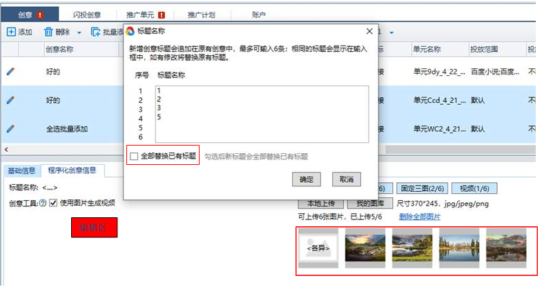 批量編輯標題名稱:勾選替換原有標題,將所有選中的程序化標題替換為新標題;不勾選此項,則是在原創意基礎上刪除或者添加。在此基礎上添加標題,如有任一條創意數量超上限系統將報錯,此次添加無效。