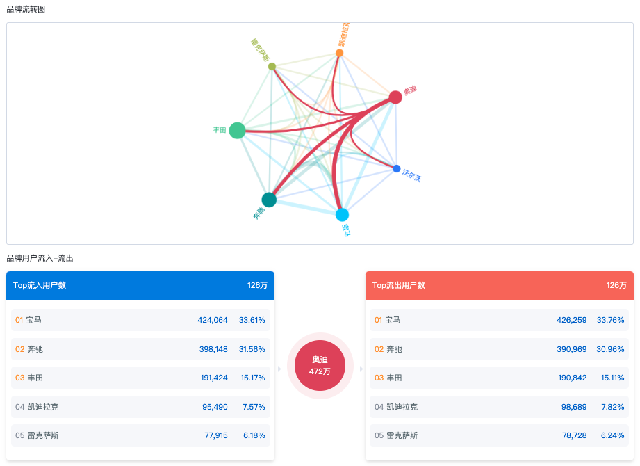 通過流轉圖及流出-流出用戶數,直觀呈現品牌用戶的競品流轉偏好;