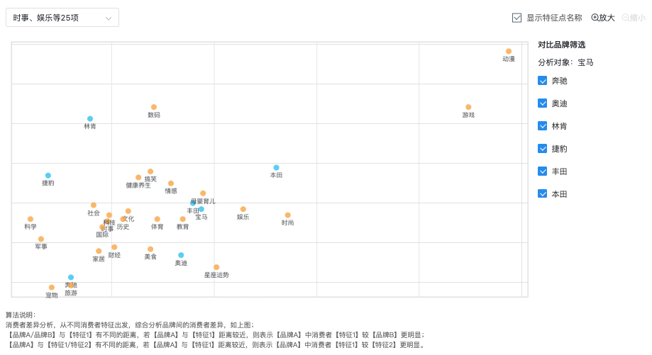 【旅游】特征,離奔馳最近,其次是奧迪/捷豹等品牌,可判斷為奔馳消費者在5月期間對旅游類內容較其他品牌,更顯著;【動漫/游戲】2個閱讀特征,離所有汽車品牌都很遠,表示汽車消費者對游戲/動漫類內容的閱讀偏好都不強;