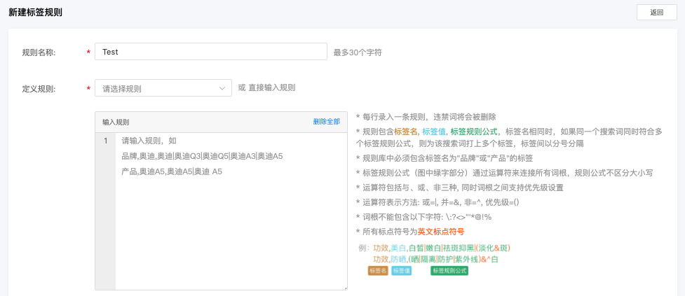 備注:定義標簽規則時,建議以【詞根】形式定義標簽規則,不需要為所有關鍵詞打標簽;