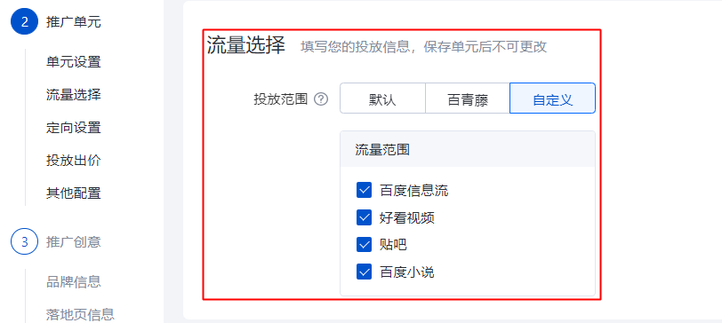 但針對定向【自定義】流量(如下圖,自定義流量包含百度信息流,好看視頻,貼吧和百度小說4種)的單元,因為數據報告和推廣管理列表呈現數據的邏輯不同,會出現看起來不一致的情況,實際上數據是一致的。