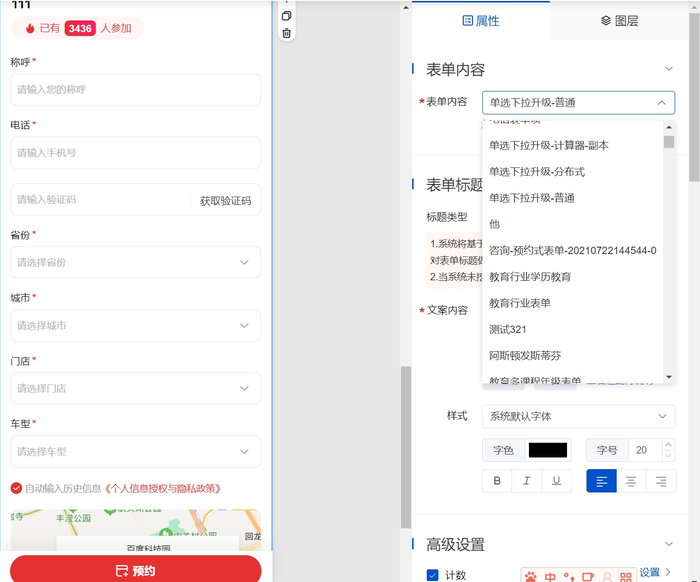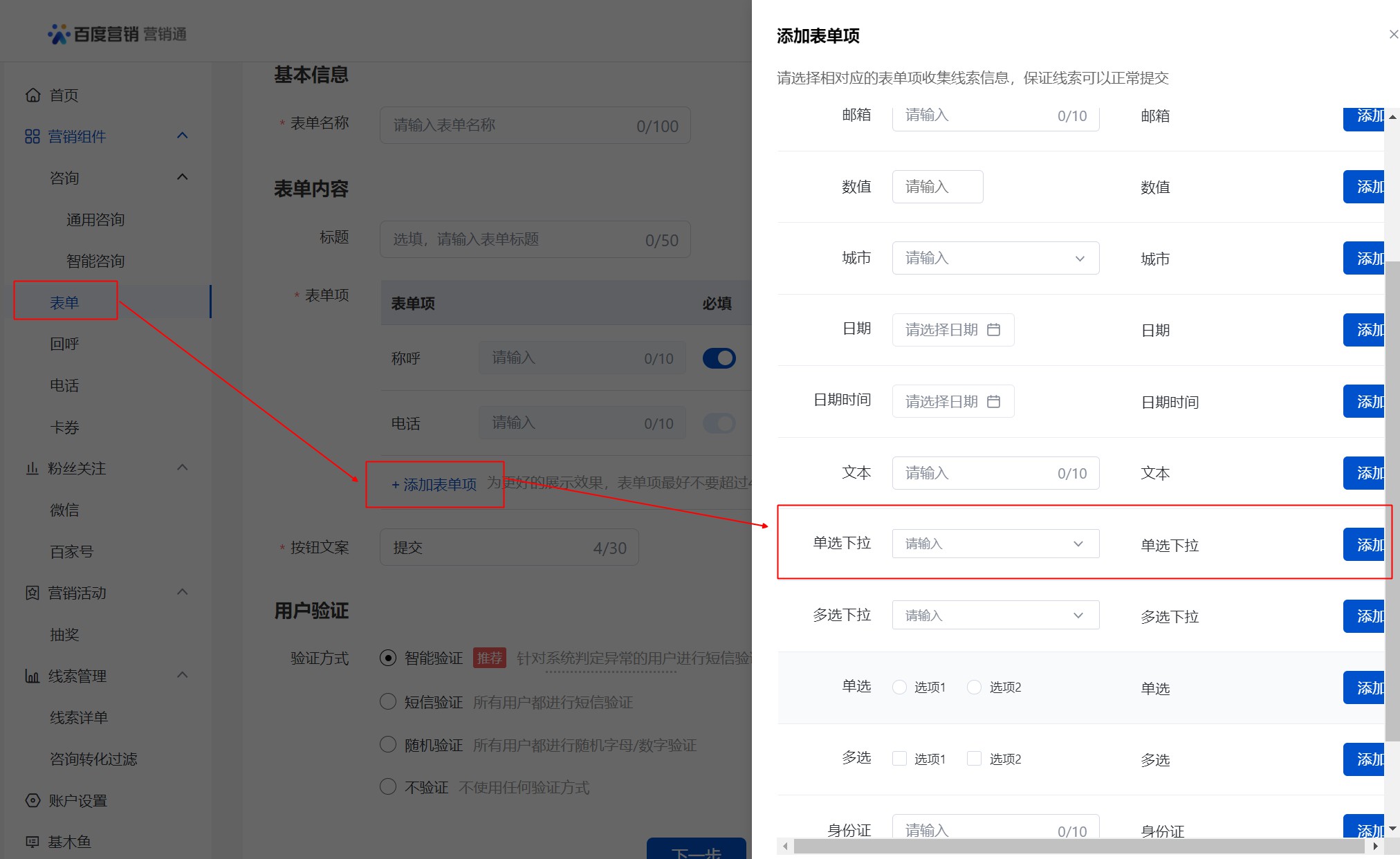 第一步:新建單選下拉表單:在營銷通-表單-新建表單,表單項選擇添加“單選下拉”
