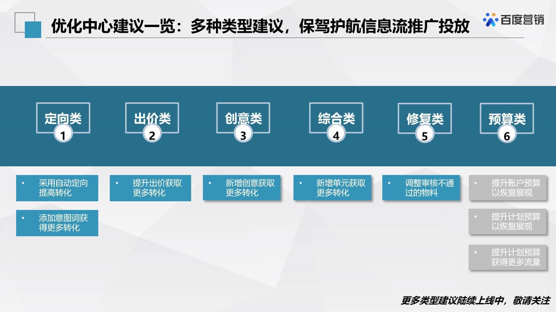 信息流優(yōu)化中心自6.22上線以來(lái),已陸續(xù)上線“新增自動(dòng)定向、添加意圖詞、提升出價(jià)”三種建議,基于個(gè)性化診斷提供優(yōu)化建議和效果預(yù)估,提高診斷洞察和優(yōu)化決策的效率。本次結(jié)合實(shí)際投放優(yōu)化訴求及場(chǎng)景,對(duì)信息流優(yōu)化中心進(jìn)行升級(jí),新增創(chuàng)意類、綜合類、修復(fù)類優(yōu)化建議卡片,為您的賬戶每日定制針對(duì)信息流推廣的全方位優(yōu)化方案,輔助投放調(diào)優(yōu),同時(shí)提供便捷操作優(yōu)化入口,幫助投放效果與效率雙提升。