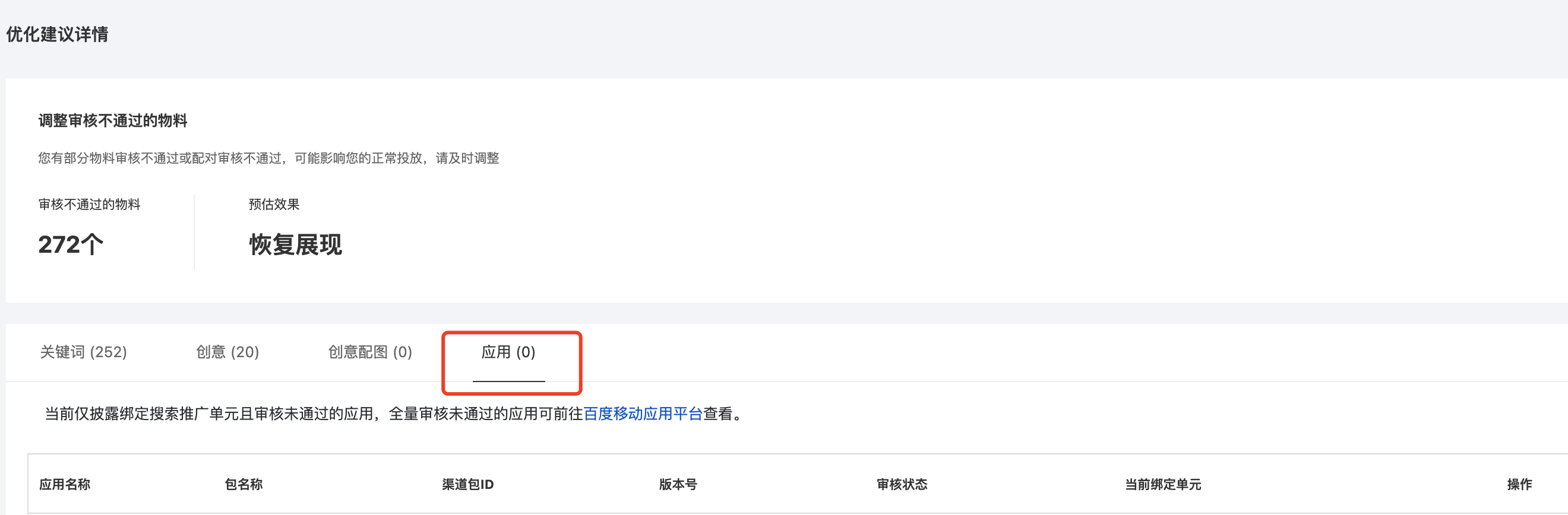 在應(yīng)用推廣場景下的客戶,可將百度移動應(yīng)用平臺的應(yīng)用綁定至搜索推廣單元。但,當(dāng)某個應(yīng)用審核不通過時(shí),綁定該應(yīng)用的單元狀態(tài)會變?yōu)椤皯?yīng)用無效”,導(dǎo)致廣告無法正常投放,影響客戶投放效果。為幫助客戶快速發(fā)現(xiàn)審核不通過且已綁定單元的應(yīng)用,搜索推廣優(yōu)化中心【調(diào)整審核不通過的物料】建議將于2021年9月16日升級,新增披露審核不通過的應(yīng)用詳情,以及時(shí)提醒客戶修改應(yīng)用從而恢復(fù)正常投放。