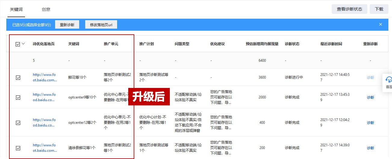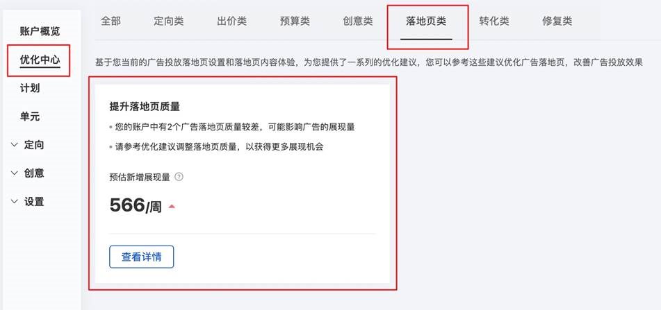 優化中心“提升落地頁質量建議”易用性升級-搜索推廣
