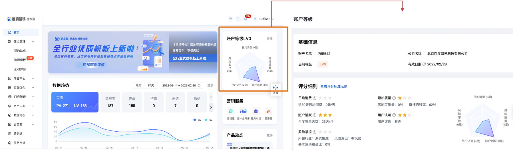 2.功能簡(jiǎn)述:基木魚(yú)賬戶等級(jí)設(shè)有LV0~LV5,依據(jù)消費(fèi)量級(jí)、風(fēng)險(xiǎn)掌控力、建站質(zhì)量、賬戶活躍度、用戶認(rèn)可5個(gè)評(píng)分維度進(jìn)行賬戶等級(jí)計(jì)算。系統(tǒng)每月1日自動(dòng)更新賬戶等級(jí)相關(guān)信息,查看路徑:在基木魚(yú)平臺(tái)首頁(yè)右上方,即可查看您的賬戶等級(jí),點(diǎn)擊“更多”即可查看賬戶等級(jí)的各維度評(píng)分及權(quán)益信息。