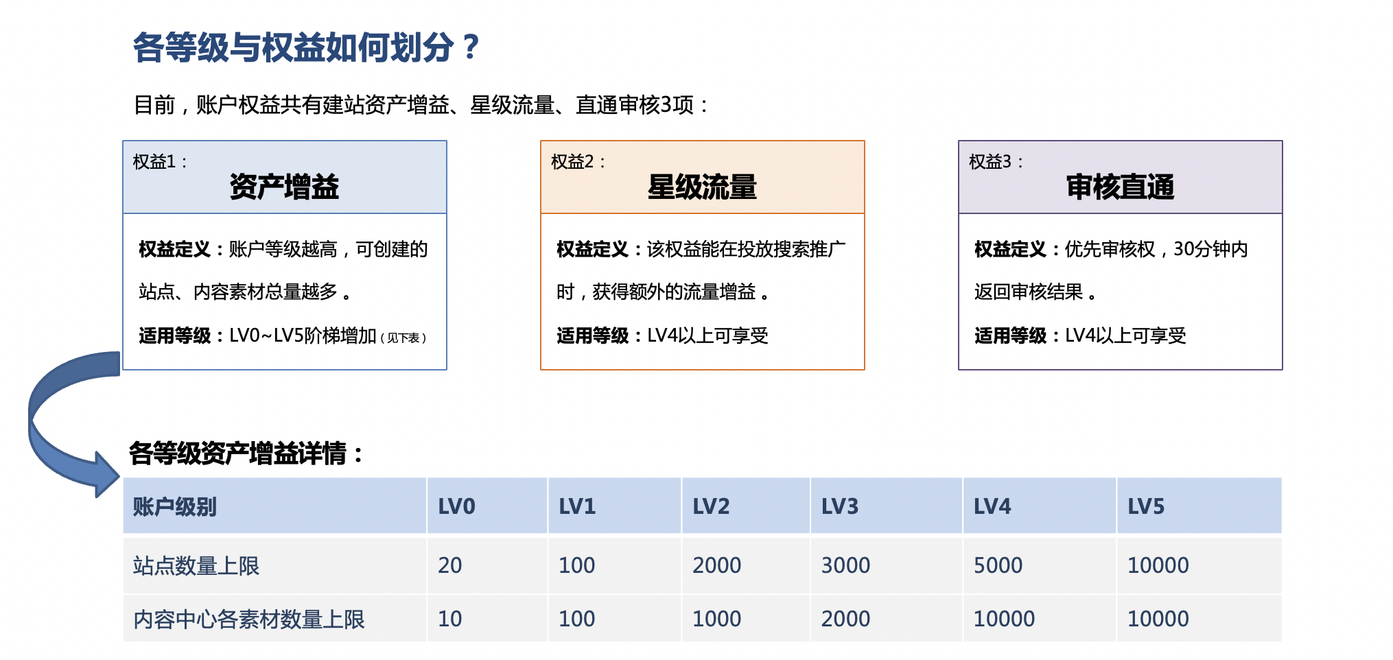 3.等級(jí)與權(quán)益劃分:目前,賬戶權(quán)益共有建站資產(chǎn)增益、星級(jí)流量、直通審核3項(xiàng),其中,星級(jí)流量與審核直通僅限LV4以上賬戶享受。