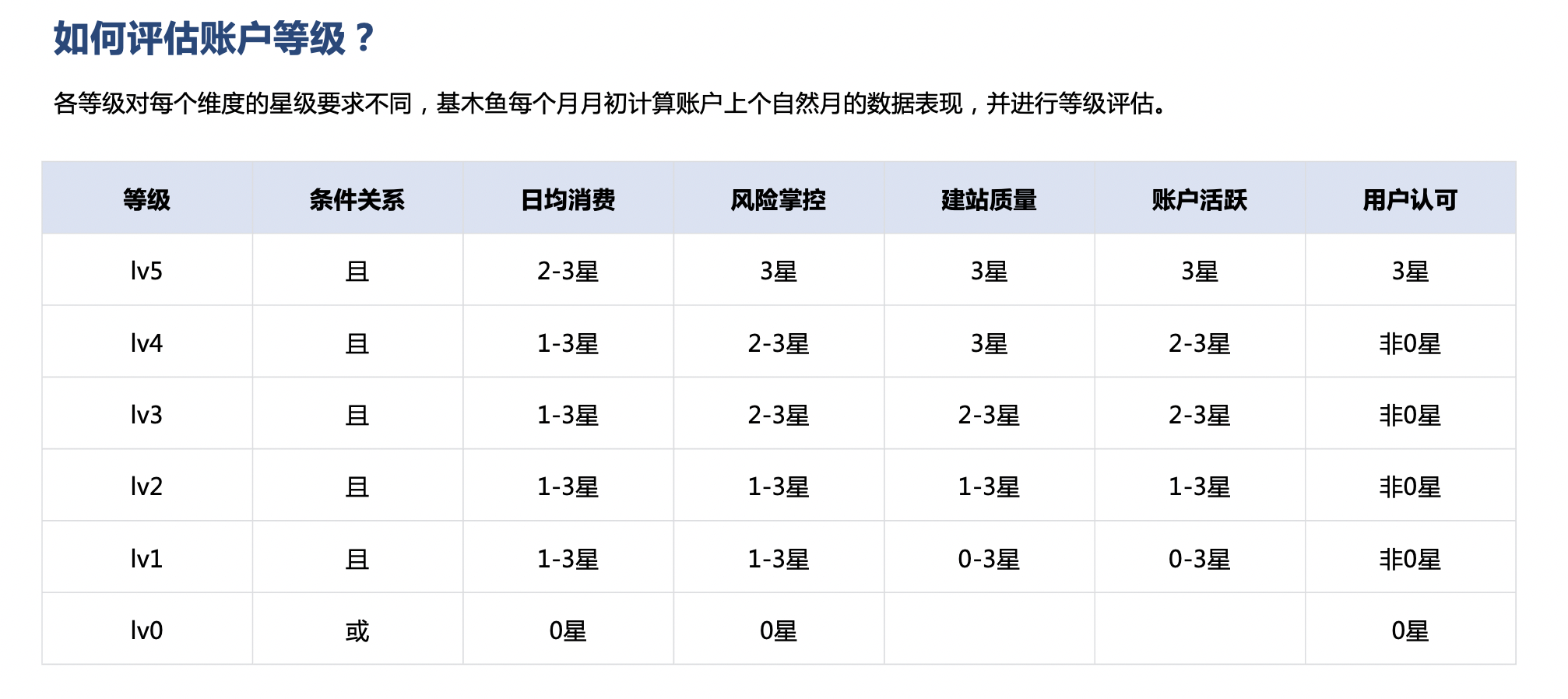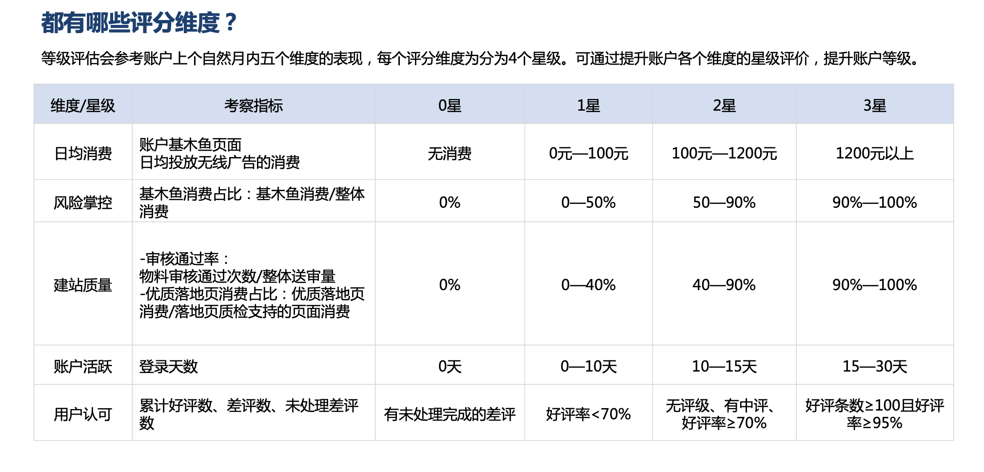 4.賬戶等級(jí)評(píng)估方式:等級(jí)評(píng)估會(huì)參考賬戶上個(gè)自然月內(nèi)五個(gè)維度的表現(xiàn),計(jì)算出所屬等級(jí)。