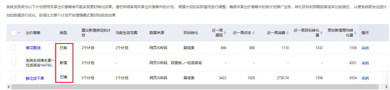 1.當某些未綁定出價策略的計劃在推廣業務、目標轉化、轉化成本上與在投的增強模式出價策略接近時,系統會推薦將這些計劃加入到“已有”類型出價策略;