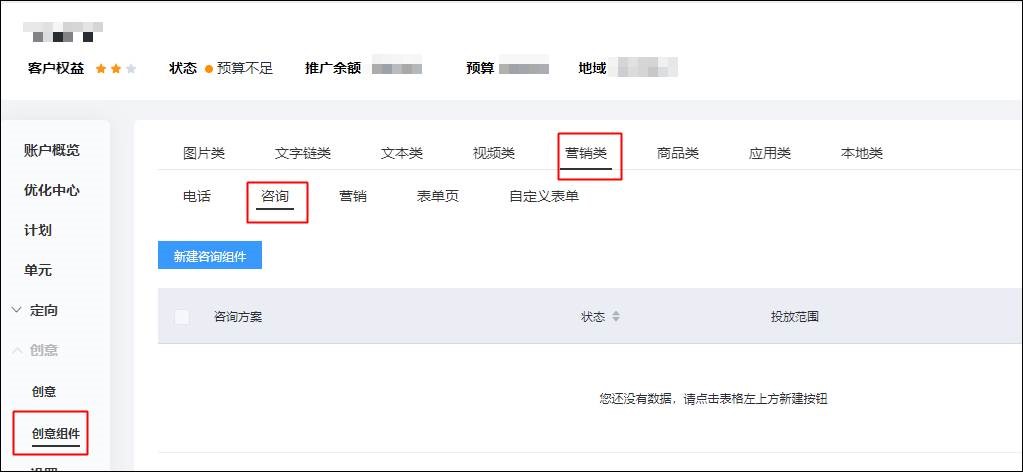 2.1 入口:搜索推廣投放平臺(tái)-創(chuàng)意組件-營(yíng)銷類-咨詢