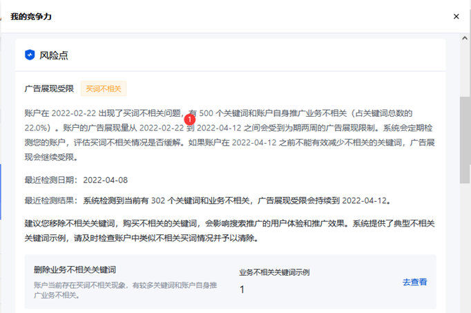 1)提供風(fēng)險點(diǎn)原因匯總概述:本次買詞不相關(guān)問題發(fā)生日期、買詞不相關(guān)問題發(fā)生時賬戶中存在不相關(guān)關(guān)鍵詞數(shù)量,日期與數(shù)量不會變化,直至本次修復(fù)完成。修復(fù)完成后,風(fēng)險點(diǎn)將不再提示;