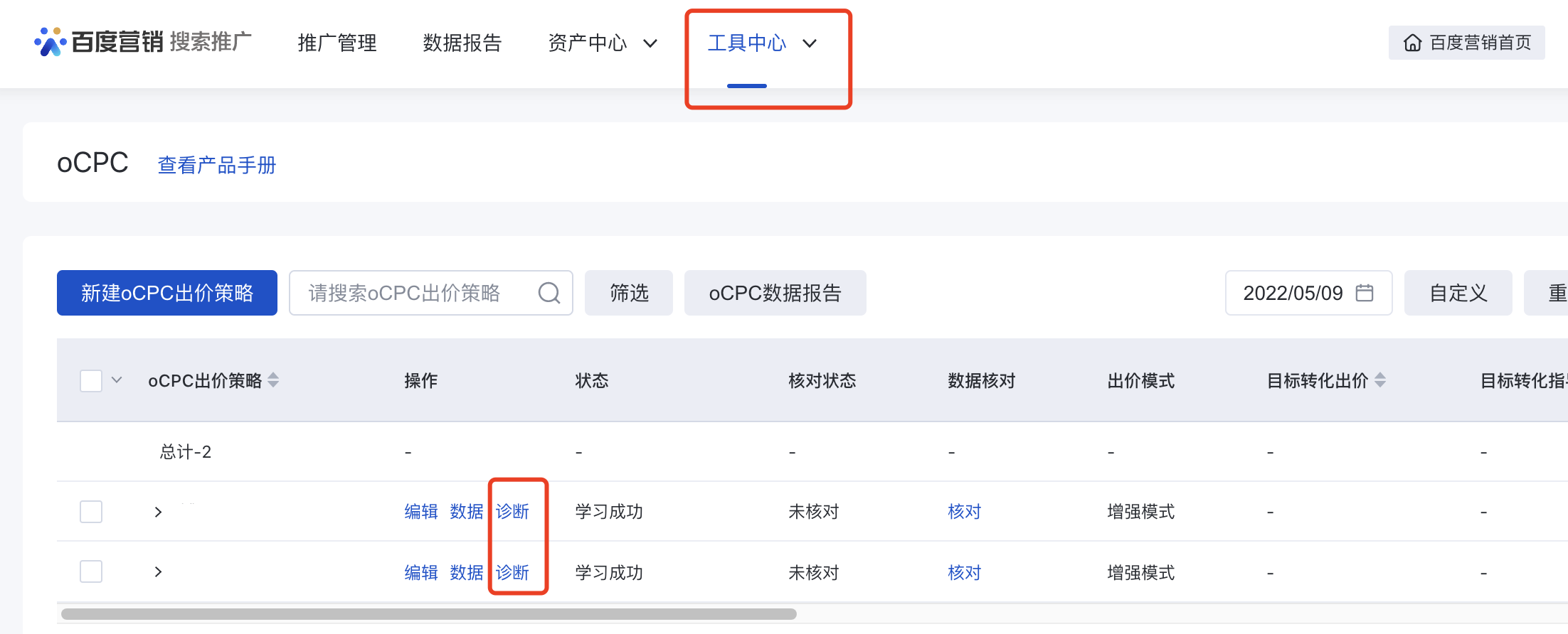 入口1:工具中心-優(yōu)化工具-oCPC-操作列-診斷