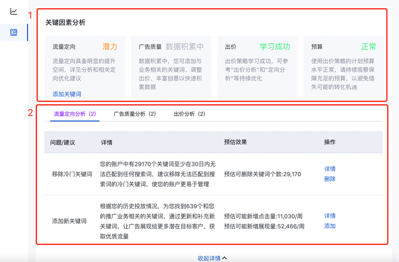 針對(duì)各個(gè)關(guān)鍵因素,系統(tǒng)會(huì)提供當(dāng)前關(guān)鍵因素存在的問(wèn)題,并聯(lián)動(dòng)優(yōu)化中心提供相應(yīng)的優(yōu)化建議供您參考,您可直接在當(dāng)前頁(yè)面進(jìn)行添加,也可點(diǎn)擊詳情,跳轉(zhuǎn)至【優(yōu)化中心】查看具體建議;