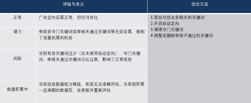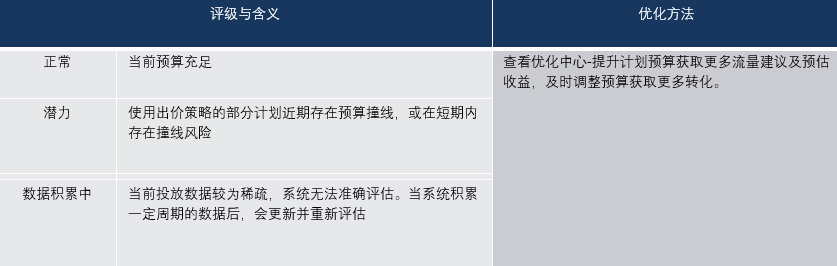 1)系統(tǒng)根據(jù)您出價(jià)策略所綁定計(jì)劃的設(shè)置及當(dāng)前投放情況,對(duì)“流量定向、廣告質(zhì)量、預(yù)算”等關(guān)鍵因素進(jìn)行“風(fēng)險(xiǎn)、潛力、正常”評(píng)級(jí),對(duì)“出價(jià)”進(jìn)行學(xué)習(xí)狀態(tài)披露,幫助您及時(shí)了解當(dāng)前投放情況;