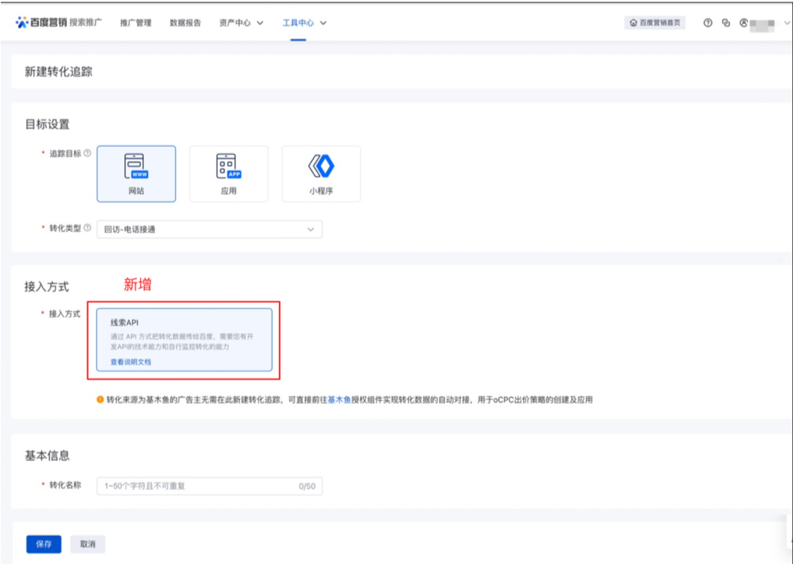 搜索推廣投放平臺(tái)->工具中心->轉(zhuǎn)化追蹤->新建/編輯轉(zhuǎn)化追蹤