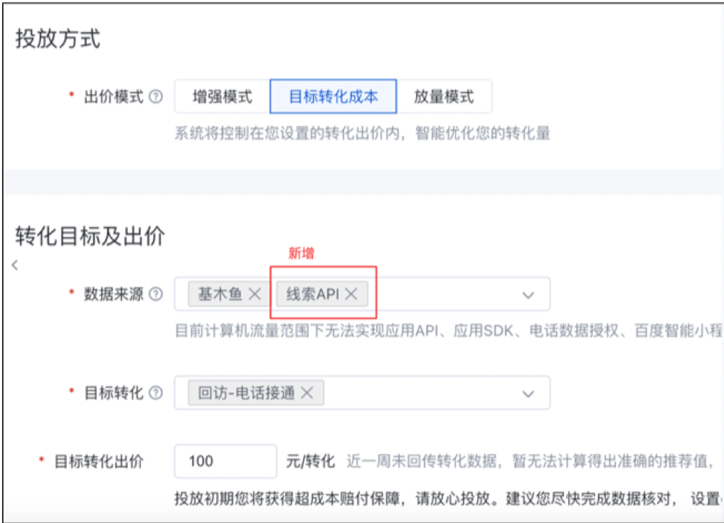 新建/編輯“出價(jià)模式為目標(biāo)轉(zhuǎn)化成本、增強(qiáng)模式和放量模式”的計(jì)劃時(shí),以目標(biāo)轉(zhuǎn)化“回訪-電話(huà)接通”為例,增加“線(xiàn)索API”數(shù)據(jù)來(lái)源