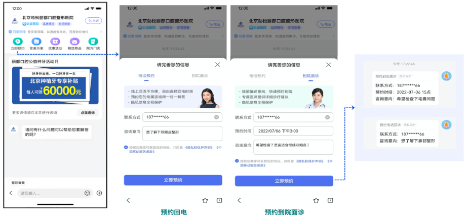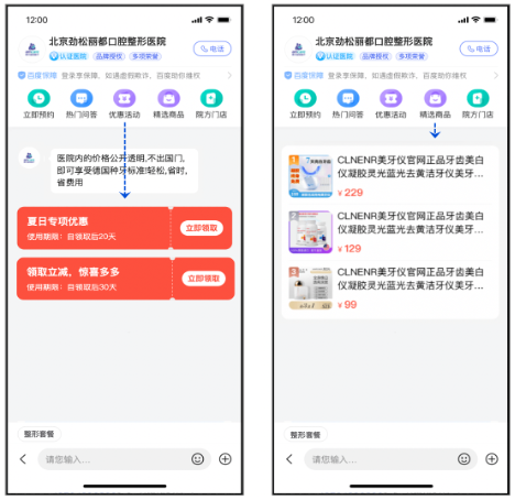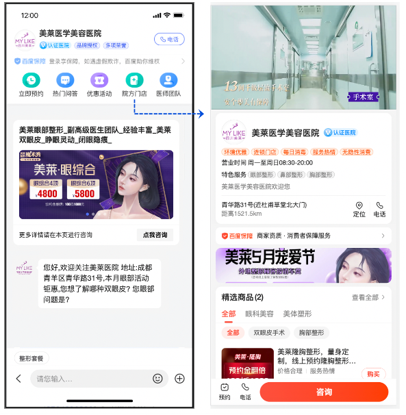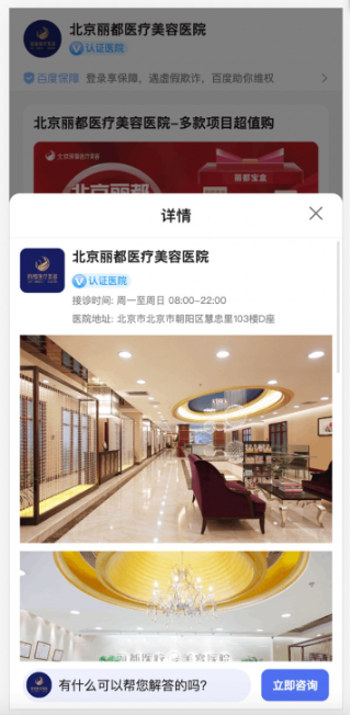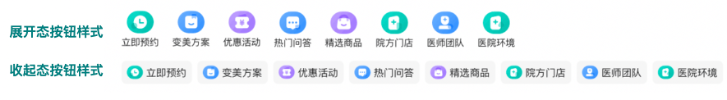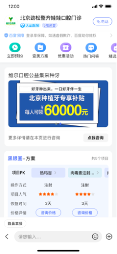 2、展現內容包括:立即預約、熱門問答、變美方案、優惠活動(卡券)、精選商品(商品)、院方門店、醫師團隊、醫院環境;