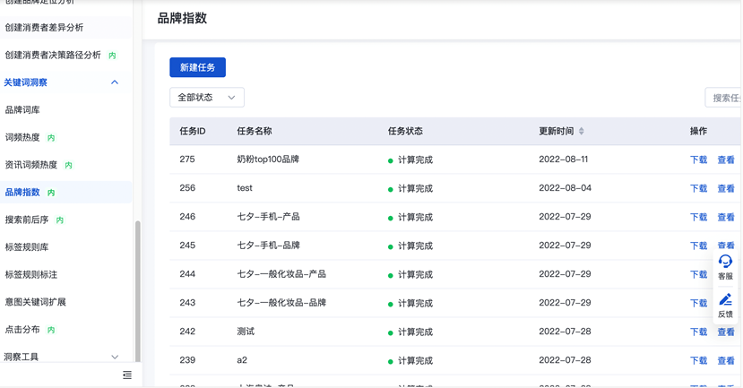 入口:觀星盤>洞察中心>關鍵詞洞察>品牌洞察>任務列表頁