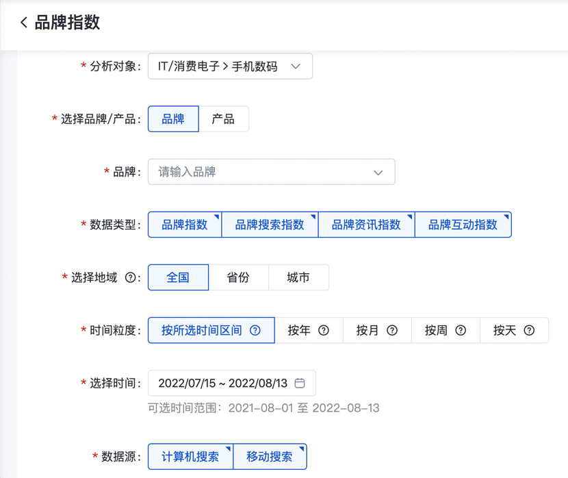 支持用戶從現有的行業中選擇品牌、產品,輸入對應地域、數據源、時間段,輸出該選擇粒度下對應的品牌指數(不區分數據源)、品牌搜索指數、品牌資訊指數(不區分數據源)、品牌互動指數。