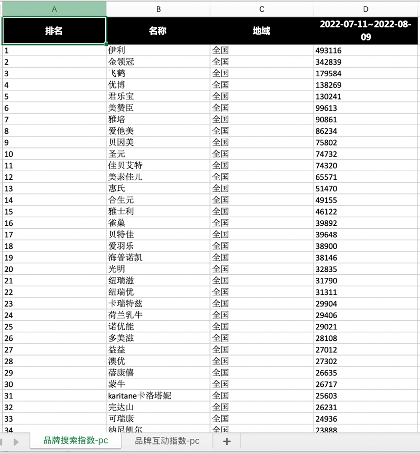sheet-不同數據指標頁:呈現對應數據指標下,品牌按數據指標排名倒序的對應數據情況