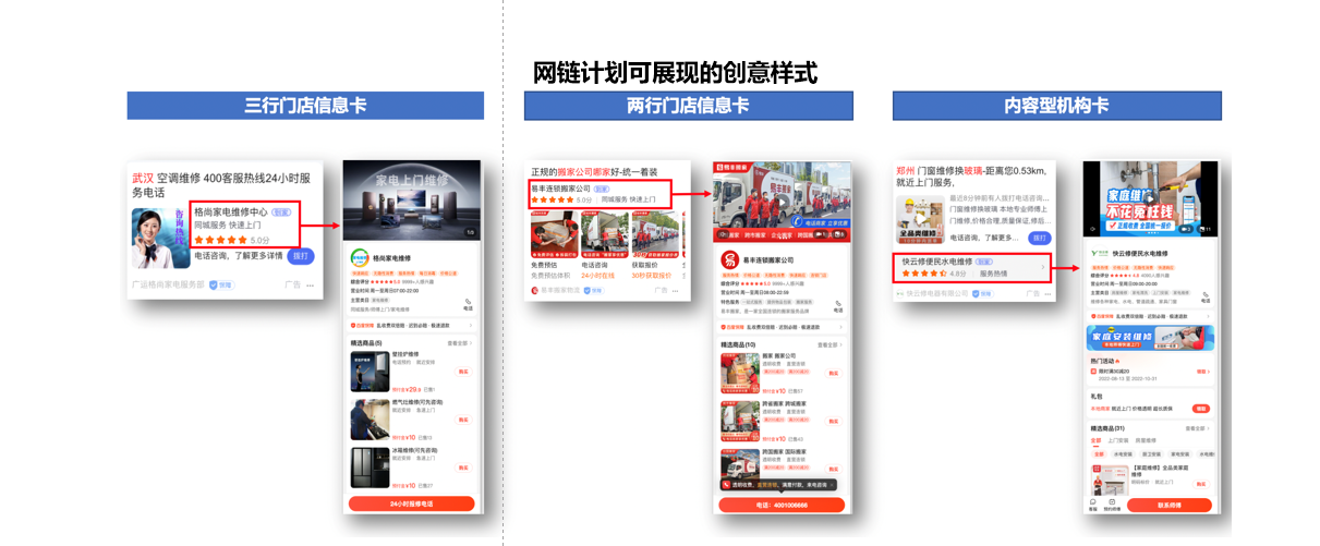 網鏈計劃可展現的創(chuàng)意樣式:三行門店信息卡、兩行門店信息卡、內容型機構卡