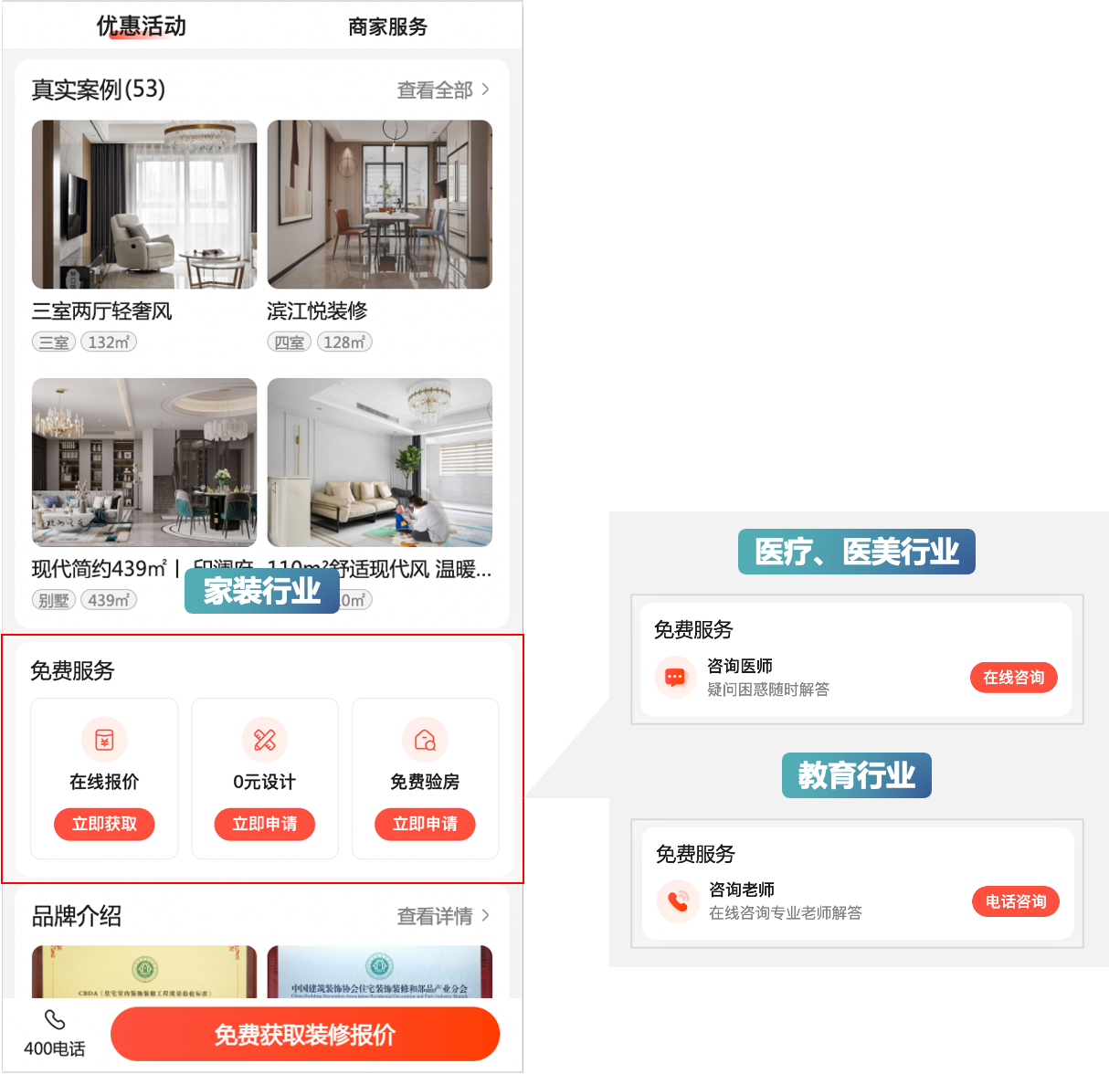 家裝、教育、醫療、醫美行業的商家店鋪首頁支持增加【免費服務】模塊,不同行業可配置的內容存在差異(如下圖所示),該模塊在店鋪首頁中的位置位于【真實案例】模塊之后,網民可通過點擊該模塊聯系商家。