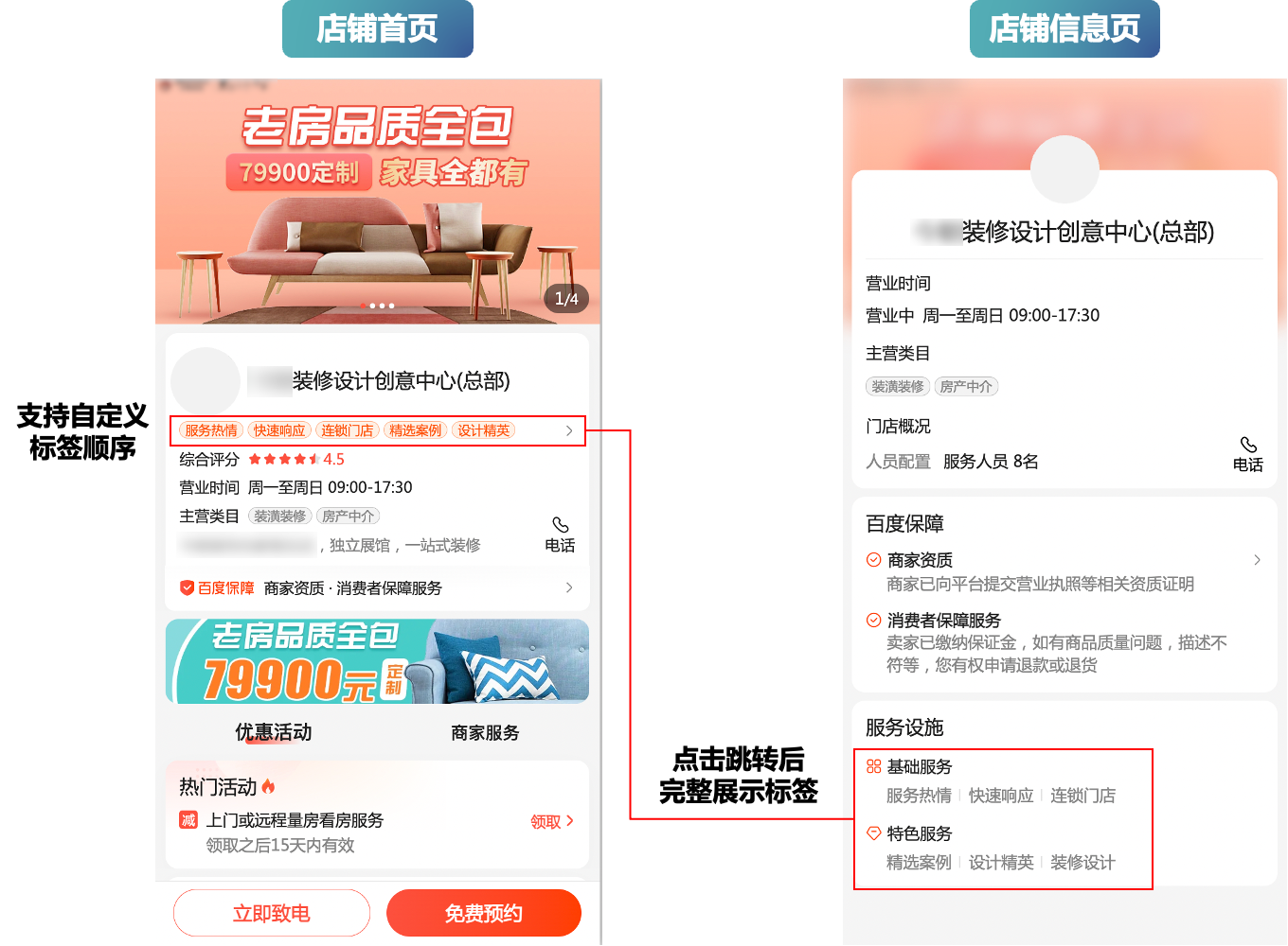 店鋪首頁的【服務標簽】模塊已經支持商家選擇和展示多個標簽,本次升級支持商家自定義多個標簽的展示順序,且“基礎服務標簽”和“特色服務標簽”可以混合排序。