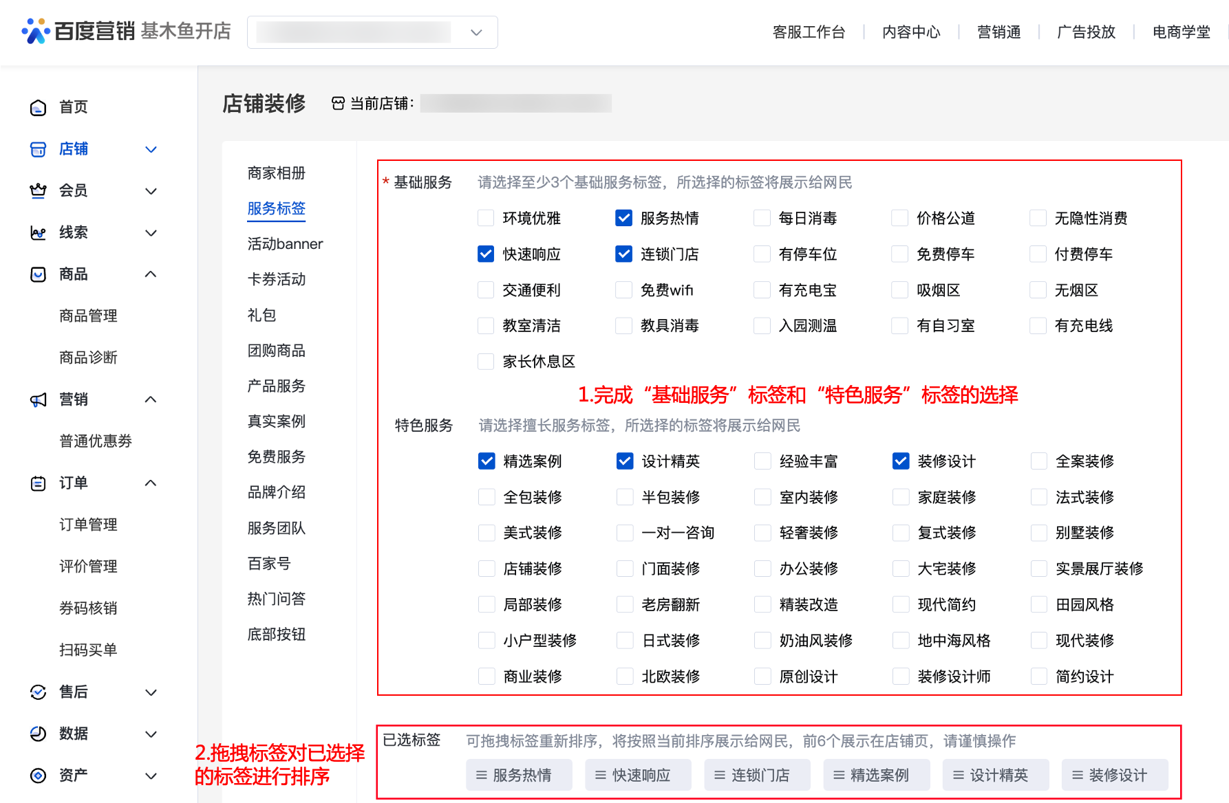 路徑:基木魚開店-本地生活——店鋪——店鋪裝修——服務標簽,選中適配標簽并進行排序即可