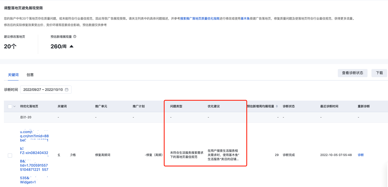 當您賬戶中有落地頁存在質量問題,或未能符合行業(yè)最佳規(guī)范,因此導致廣告展現(xiàn)受限時,優(yōu)化中心會為您推送該建議。系統(tǒng)會基于落地頁的客觀策略模型評估,自動識別質量有問題的廣告落地頁,幫助您快速定位原因,從而提升廣告展現(xiàn)。