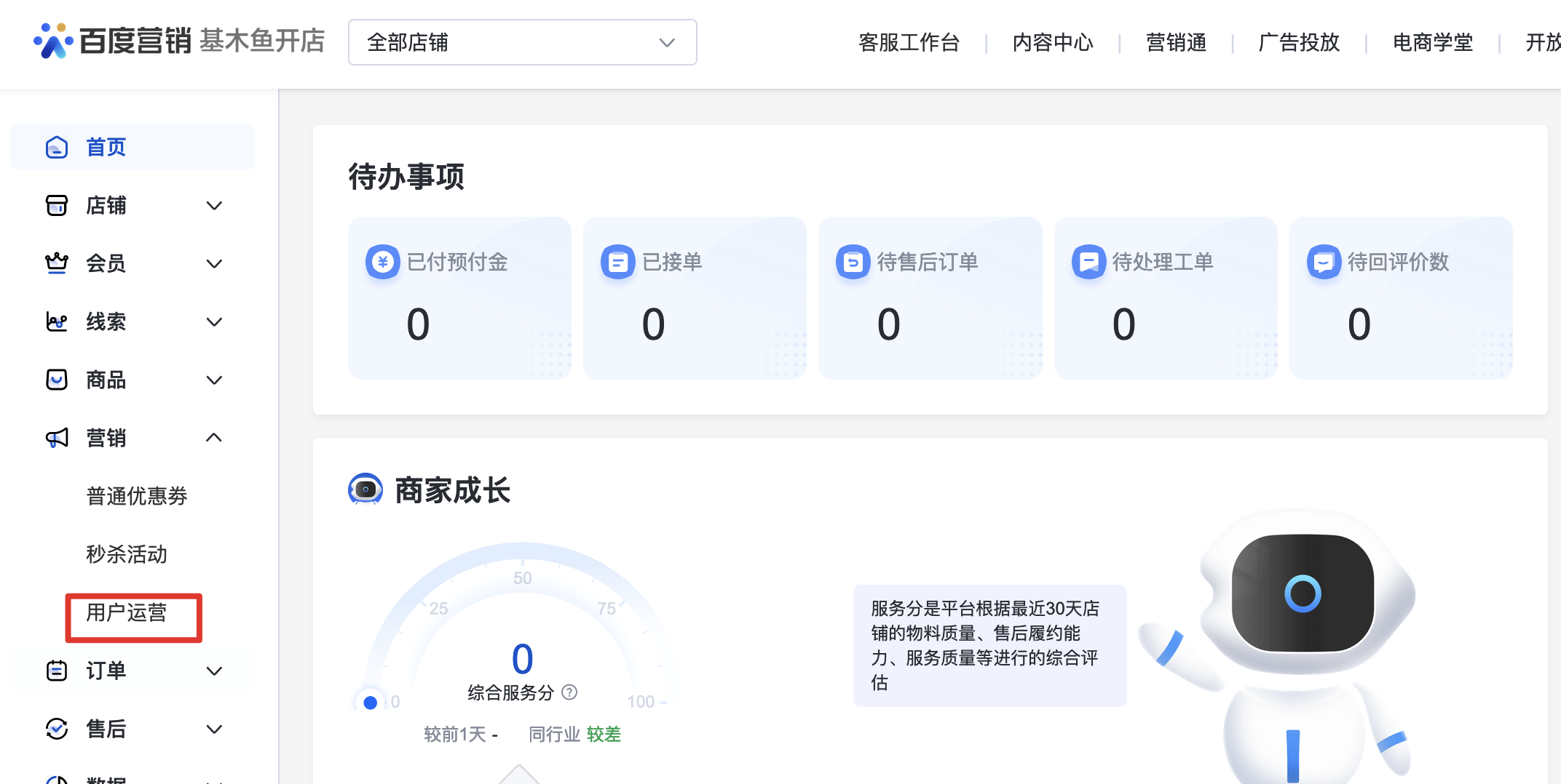3.1入口:在【營(yíng)銷】一級(jí)菜單中,新增了【用戶運(yùn)營(yíng)】二級(jí)菜單