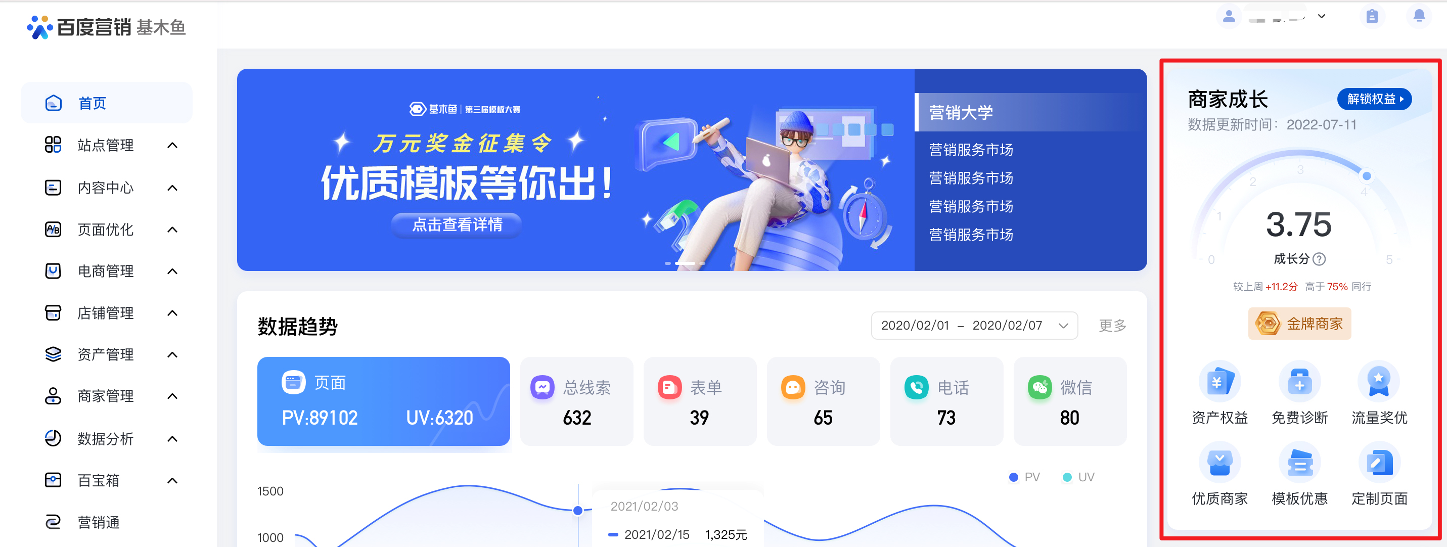 1、等級入口:商家可通過【基木-首頁-右側邊欄】查看、跳轉商家成長詳情頁