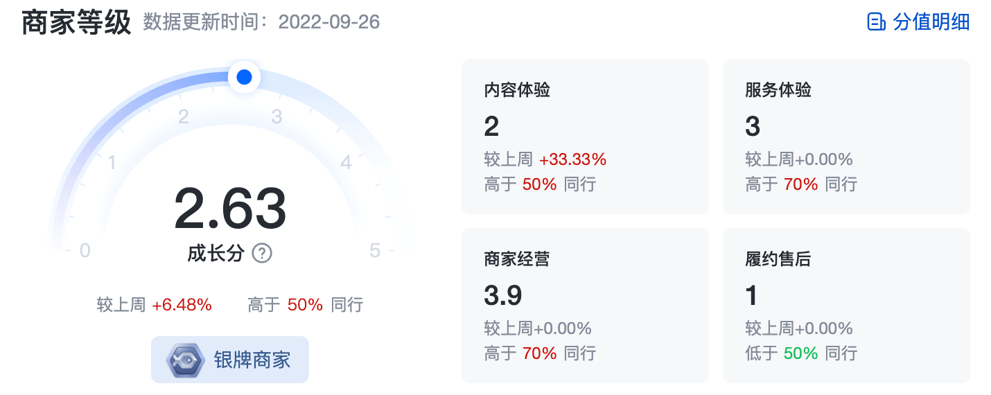 2、等級分類:由商家成長分計算得出共5個等級,不同等級對應不同權益,等級每周周一更新一次