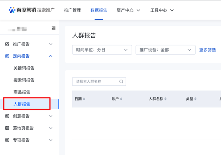 功能入口:搜索推廣->數據報告->定向報告->人群報告,如下圖方框內所示: