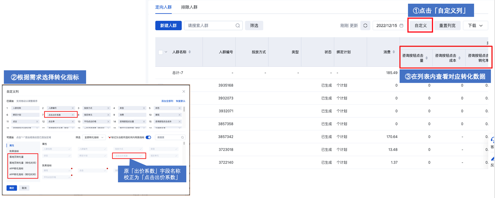 2.2 搜索推廣-人群管理列表-新增披露轉化指標,并校正「出價系數」字段名稱為「點擊出價系數」