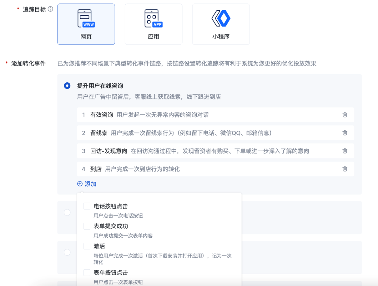 2. 新建網頁類轉化追蹤,支持同一條轉化追蹤內添加多個轉化事件:同一條轉化追蹤內,支持同一接入方式下(如線索API、網頁JS布碼等),同時添加多個轉化事件,提升操作效率。