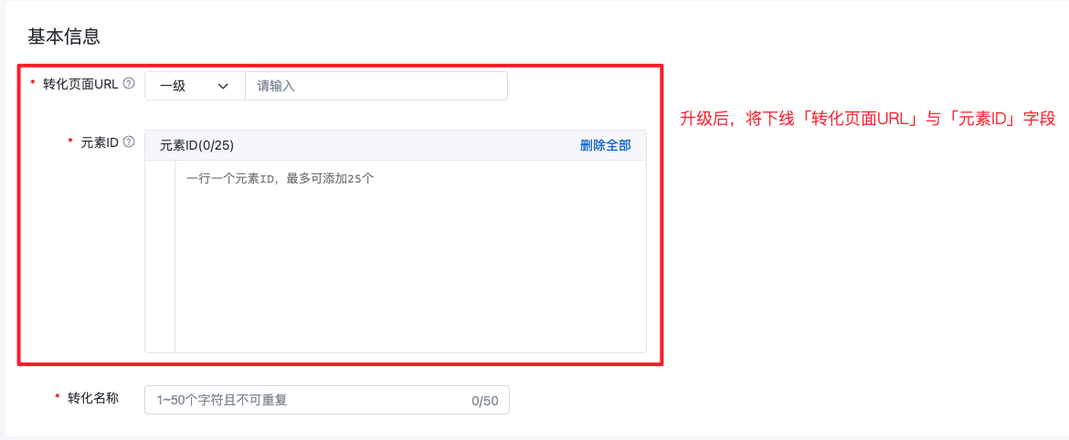 「網頁JS布碼」接入方式下,將下線「轉化URL」和「元素ID」字段:簡化創建流程,下線非必須提供的字段,無需填寫即可完成創建。