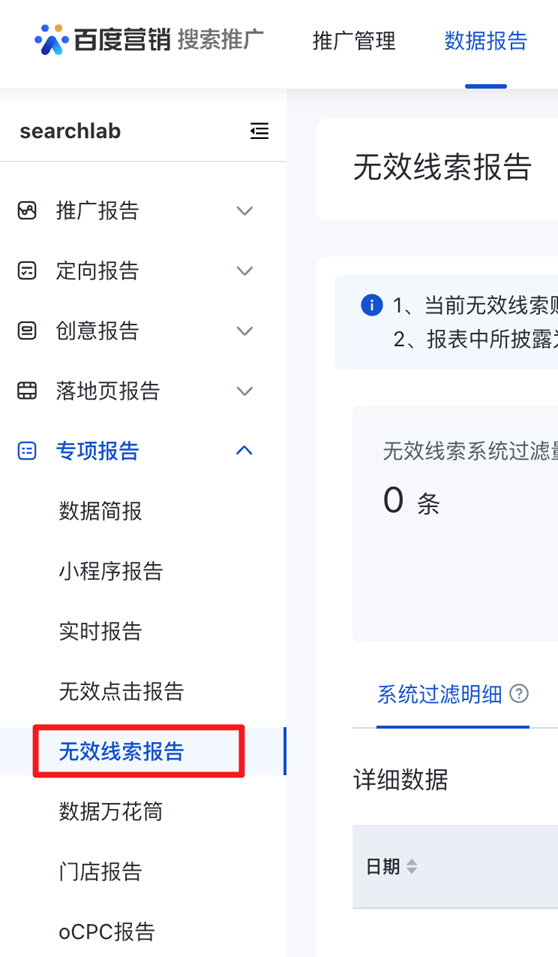 搜索推廣-數據報告新增「無效線索報告」
