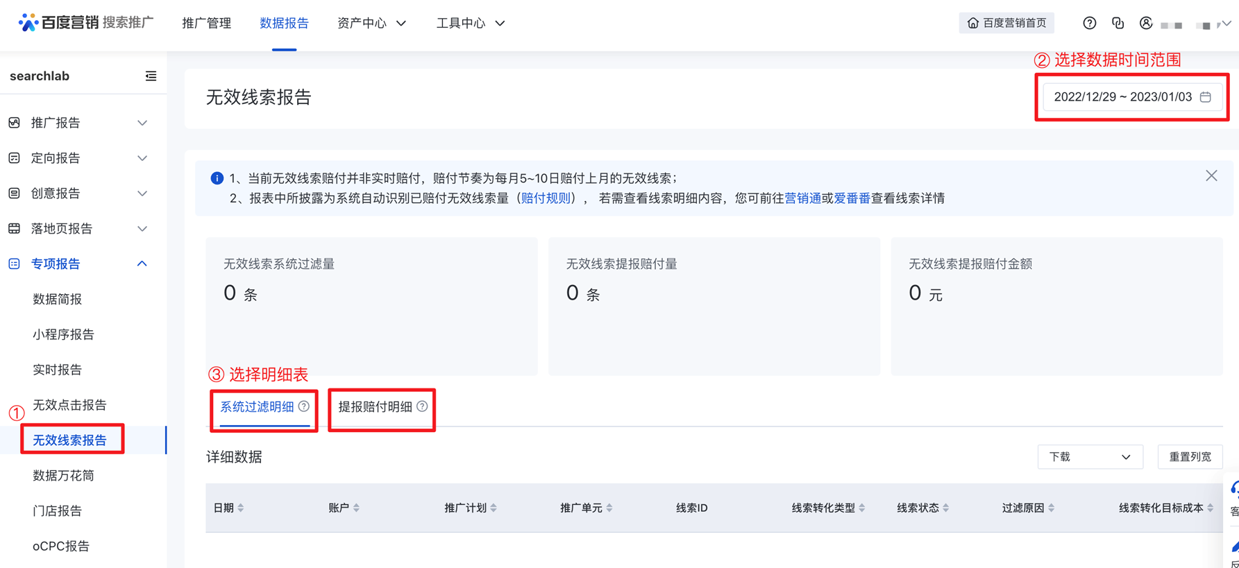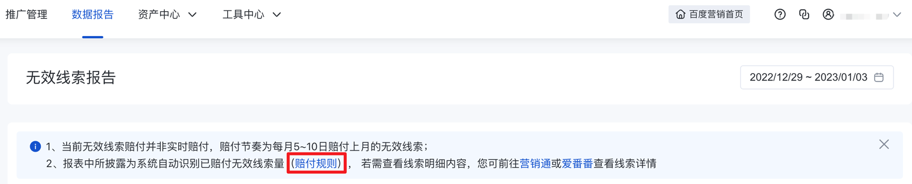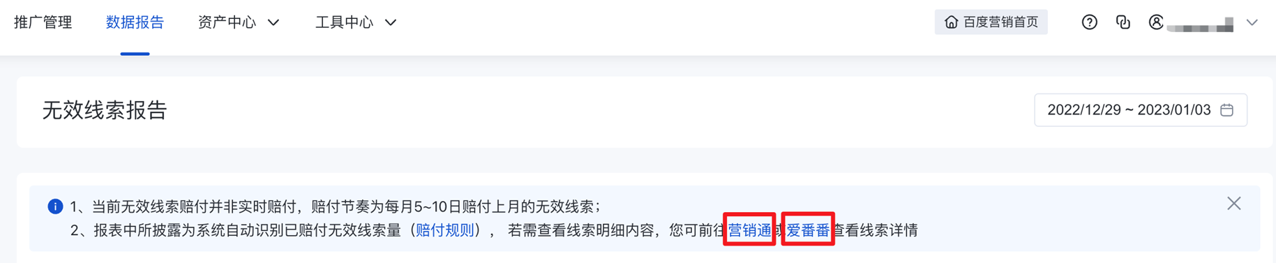 1)數據范圍&查看方式:廣告主通過營銷通、愛番番等工具跟進線索并提報無效線索后,經系統確認并賠付的線索明細將在此披露,其數據明細中的賠付金額對齊財務系統。
