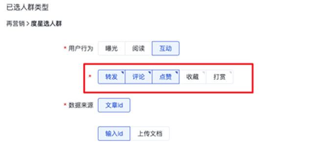 注:互動行為支持多選,取產生多種行為用戶的并集,例如選中轉發、評論、點贊,表示圈選產生過轉發、評論、點贊中至少任意一種行為的用戶