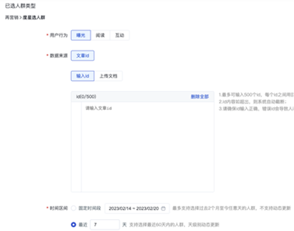 為進一步服務人群再營銷場景,觀星盤上線文章曝光及互動人群圈選功能,其中互動涵蓋轉發、評論、點贊、收藏、打賞,可通過文章ID圈選指定時間段內對文章產生上述行為的用戶,生成對應人群包,用于畫像查看及各類廣告投放,便于后續針對特定用戶群進行廣告覆蓋,縮短決策路徑,提升轉化效率。