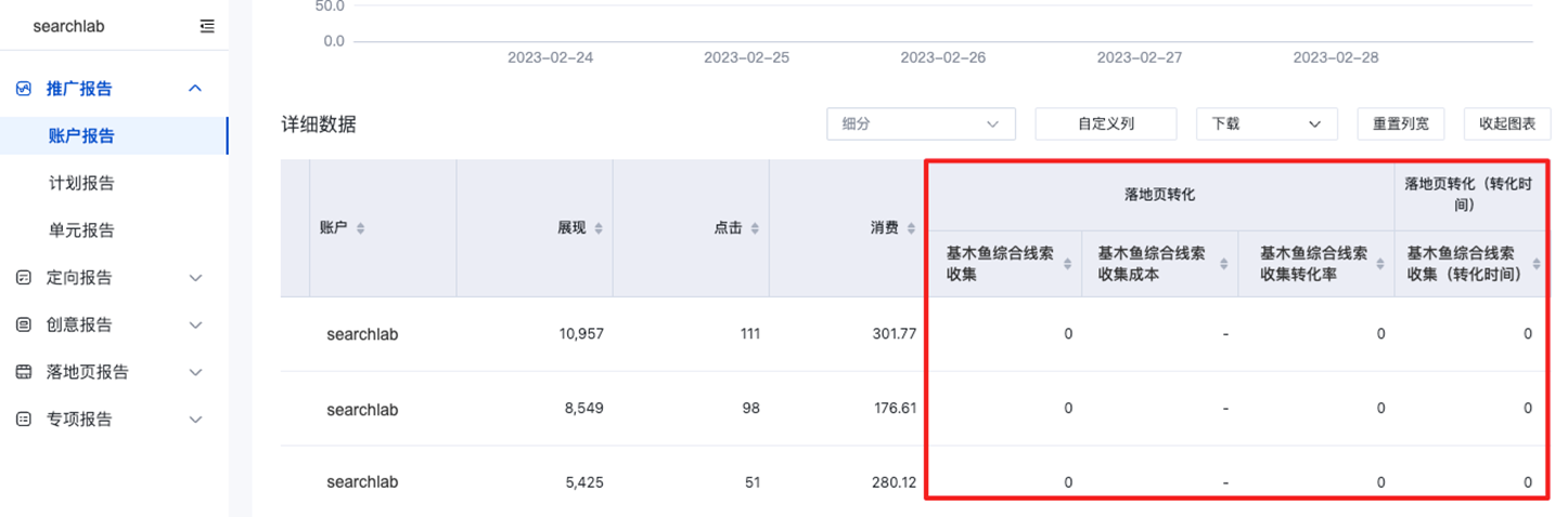 1. 賬戶報告、oCPC數據報告、客戶中心同步新增『基木魚綜合線索收集』轉化數據,可在自定義列中添加并查看;