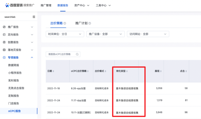 2. 在oCPC數據報告中,當選擇投放的是基木魚綜合線索收集時,“目標轉化”則顯示為基木魚綜合線索收集,同時自定義列中也可查看基木魚綜合線索收集的轉化量;