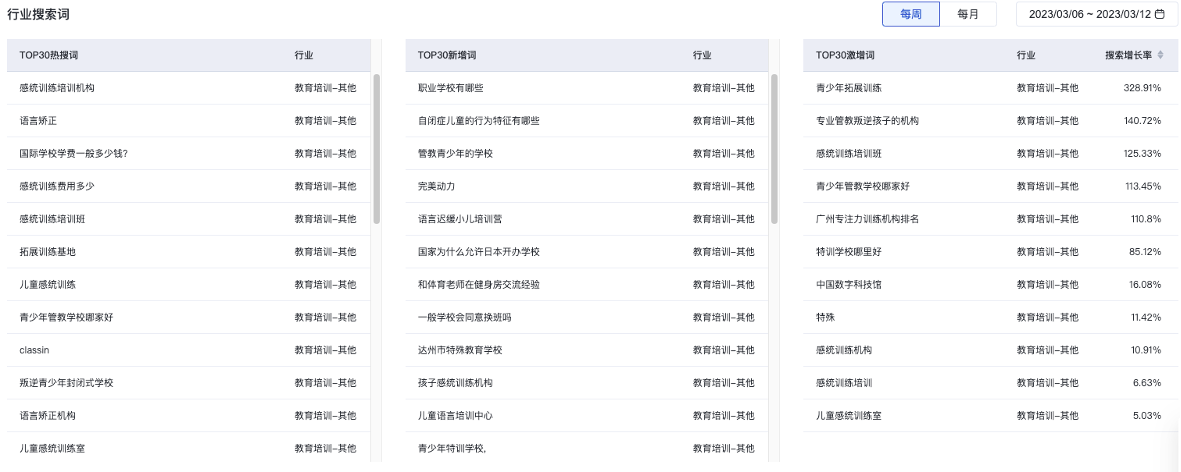 為滿足更多行業(yè)流量洞察需求,觀星盤新增教育行業(yè)28個(gè)推廣業(yè)務(wù)點(diǎn)。覆蓋職業(yè)培訓(xùn)、k12教育、興趣培訓(xùn)、教育培訓(xùn)-其他等細(xì)分二級(jí)行業(yè),呈現(xiàn)搜索趨勢(shì)、top熱搜詞、新增詞、激增詞,賦能用戶做精細(xì)化行業(yè)流量數(shù)據(jù)洞察。