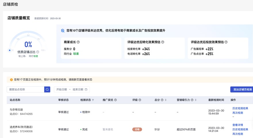 當前店鋪質量評級主要以“店鋪頁內容填充率”作為衡量指標,如商家相冊圖片/視頻數量、商品/產品數量等。本次店鋪質量評級規則全面升級,針對不同店鋪類目擬定不同評估規則,同時新增對于店鋪頁“內容質量”的評估。為了提高裝修效率,本次還上線了“裝修檢測功能”,在裝修時可顯示引導和提示,幫助客戶快速定位問題,提升店鋪頁質量。