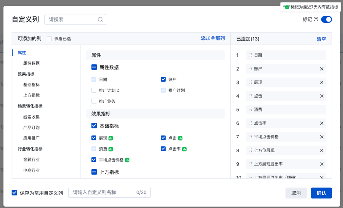 → 保存:編輯完成后,若直接點擊“確認”后完成編輯,頁面數據列表按所選字段披露數據;若勾選下方“保存為常用自定義列”,則可輸入常用自定義列名稱,此時再點擊“確認”后,即可將當前所選字段保存為常用自定義列模板,后續可在上述“選擇常用自定義列”界面直接選取查看數據。