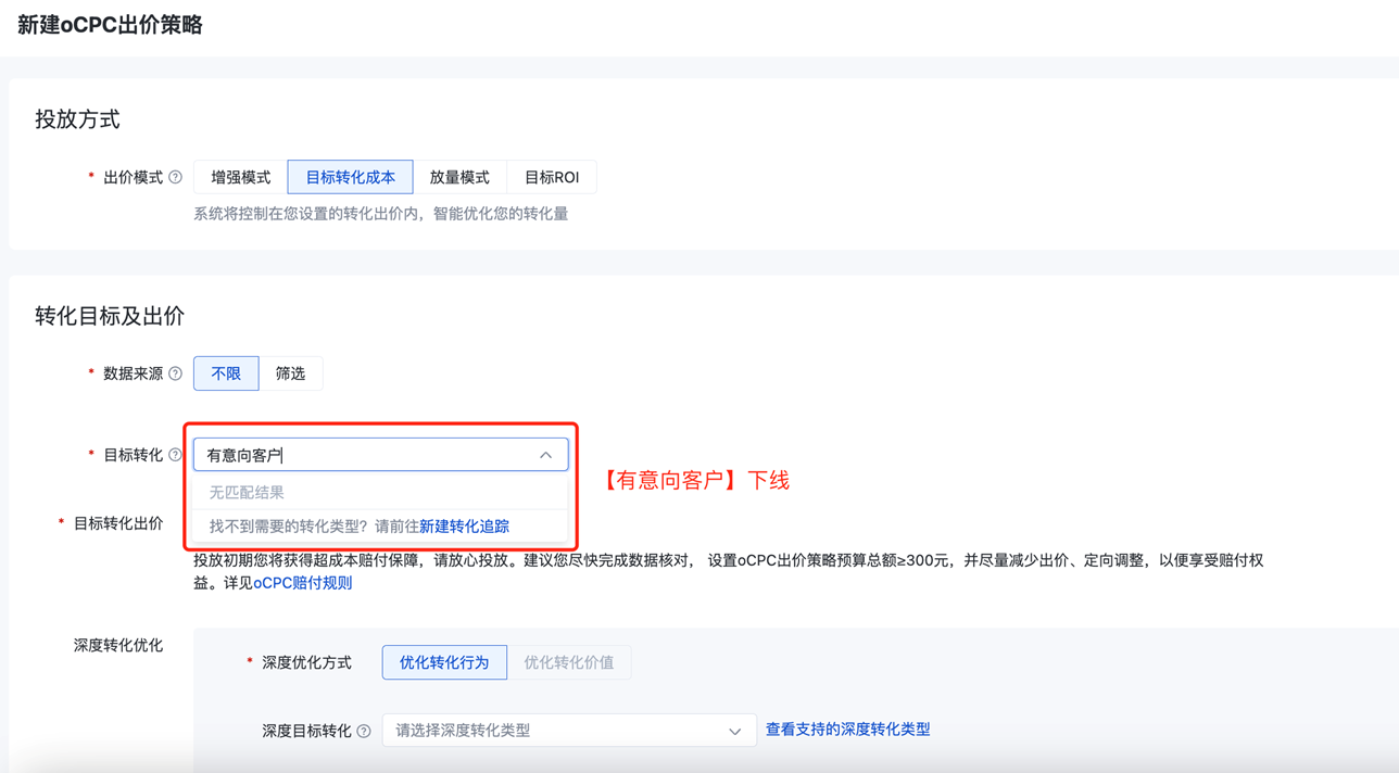 ? 搜索推廣-資產中心-出價策略-新建出價策略:目標轉化和深度轉化的可選項目中不再提供【有意向客戶】選項